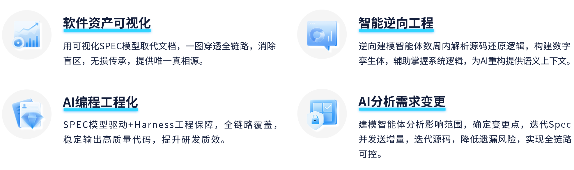 工作原理:逆向建模智能体和软件建模智能体构建和迭代软件SPEC模型(可视化软件资产),软件制造智能体从SPEC模型获取高质量输入,基于可定制的工艺流程,自动编程和测试。